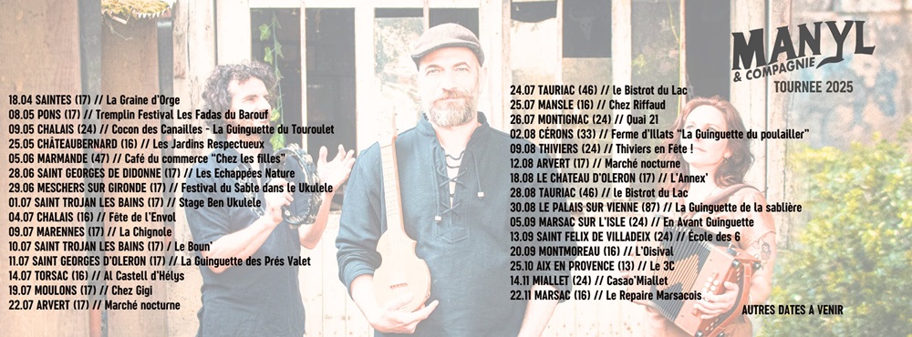 Fabien créé Manyl en 2015, au moment du premier OUF (l’Oléron Ukulélé Festival). Manyl s’est créé sur l’envie de concrétiser une influence forte, celle de son enfance et adolescence sur l’île de la Réunion. Là-bas, il était bercé par les rythmes Maloya locaux, mais aussi par les poètes et chanteurs français, ou la musique classique qu’écoutaient ses parents.